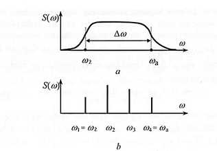 3 pav. Analoginių signalų spektrai S(ω) = |S(jω)|: a – tolydinis ir b – diskretinis